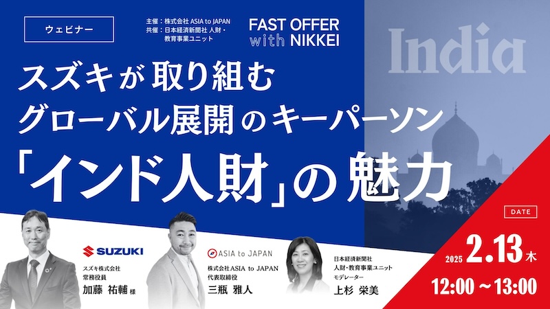 ASIA to JAPAN様のグローバル新卒採用ウェビナー「スズキが取り組むグローバル展開のキーパーソン「インド人財」の魅力」の配信を担当いたしました